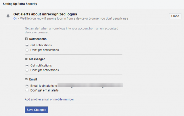 This area allows you to get alerts sent to you when a new device or browser is used to log into Facebook. It’s pretty straight forward, you can even define additional email addresses if you want. You can also have those notifications sent to you via Facebook Messenger, SMS, or as a Facebook notification. We definitely recommend at least having it set up to email you.